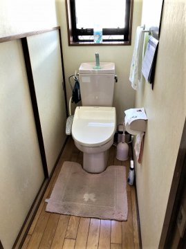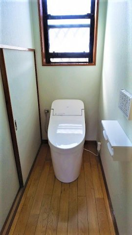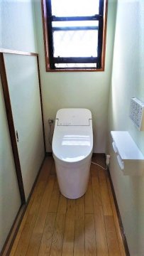 皆戸中建築の担当アドバイザー皆戸中が工事を担当させて頂き、便器を「TOTO GG3 手洗無」へ交換、同時にペーパーホルダーの交換、トイレの壁の貼替工事もさせて頂きました。