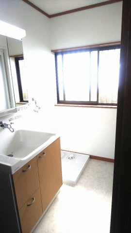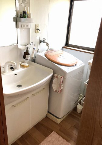 化粧洗面台は「トクラス EJ」、既存床・壁・天井は解体、天井・壁にはクロス、床はクッションフロアをはりました。電気も交換工事しました。