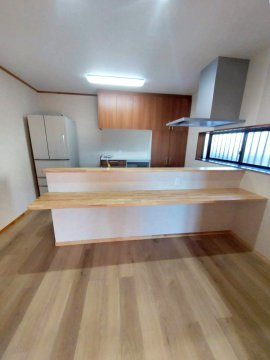 壁付けのキッチンは、憧れのカウンター付き対面式キッチンへ交換いたしました。