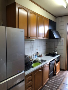 T様よりキッチンを上の収納棚の色に合わせたいとのご要望がありましたので、皆戸中建築の担当アドバイザー皆戸中がナチュラルチェリーという色で対応させて頂き、キッチン回りのタイルをキッチンパネルへと交換させて頂きました。