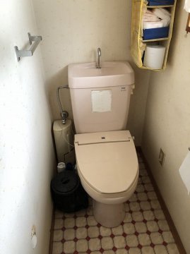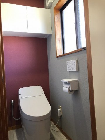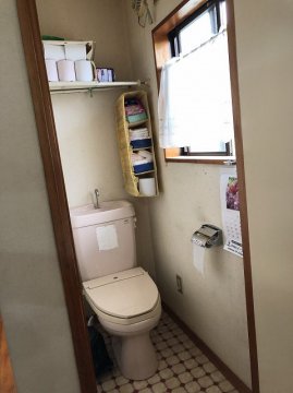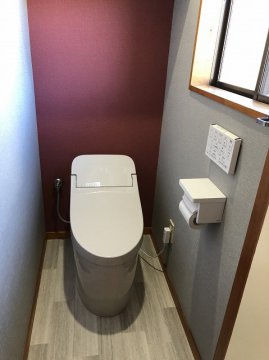 皆戸中建築の担当アドバイザー皆戸中が、2Fトイレについて、便器は「TOTO GG2」に交換させて頂き、その他付帯工事(紙巻き器・換気扇・照明の交換、棚取付、床・天井・壁の貼替え等)をさせて頂きました。