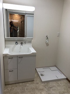 床や壁の貼替工事等もさせて頂き、明るくスッキリとした洗面室へと変身しました。