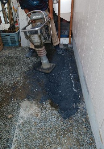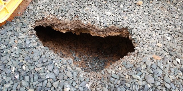 現場確認をしたところ地盤沈下のようで、はっきりとした原因は専門業者に調査してもらわないと分かりませんが、とりあえず穴埋め工事をということでしたので、陥没修繕をさせて頂きました。