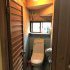併せて、腰の高さまでタイル貼りだった壁や床・クロスの貼替え、照明器具・換気扇交換、紙巻器・タオルリングの交換取付、既存ドアの開閉方向変更工事等を行わせて頂きました。