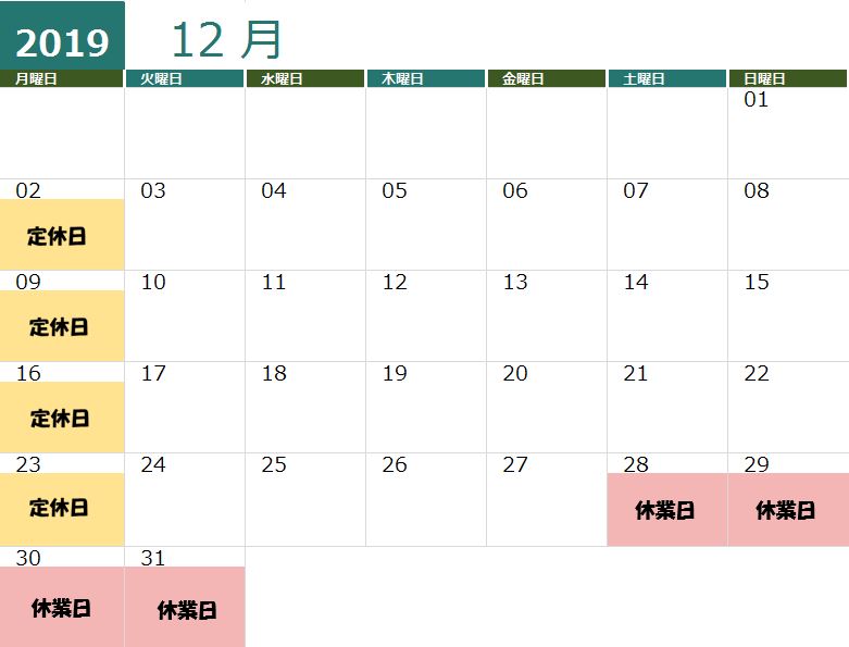 ・年末年始休業日:2019年12月28(土)~2020年1月5日(日)