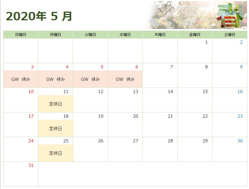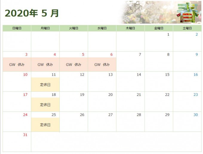 弊社では下記日程でお休みを頂きますので、よろしくお願い致します。