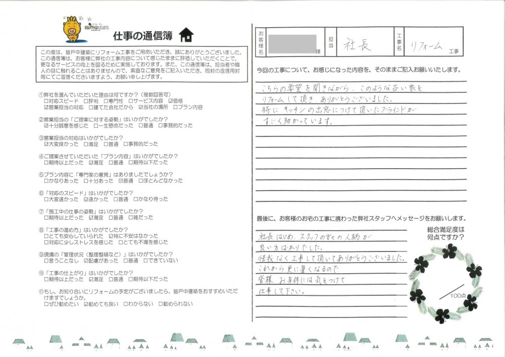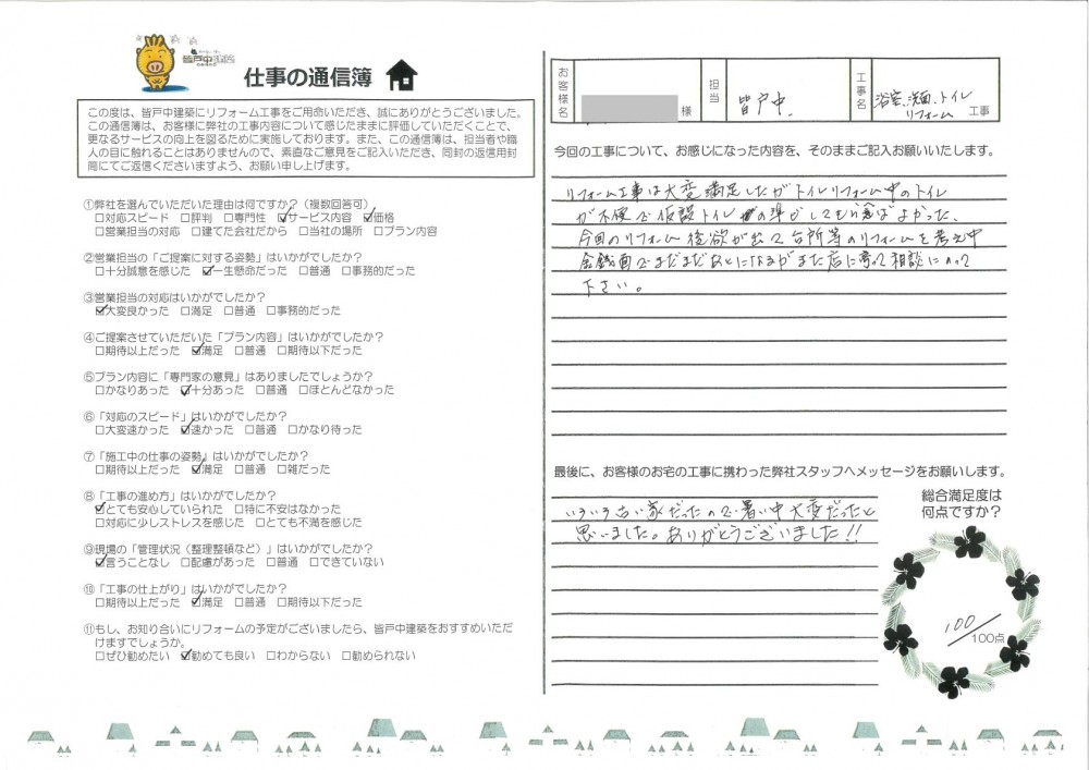 皆戸中建築でリフォームをして頂いたお客様からの「仕事の通信簿」をご紹介いたします!