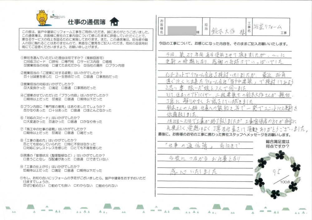 鈴木さんの人柄、仕事への熟知さ等で一発でユニットバス更新を依頼致しました。