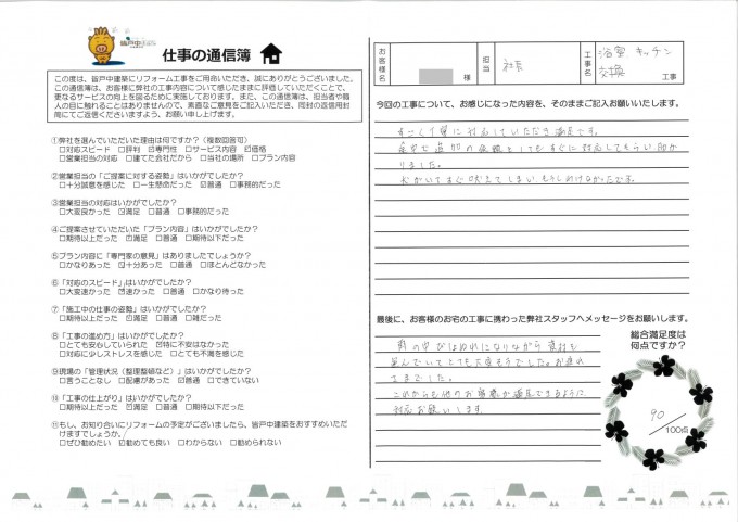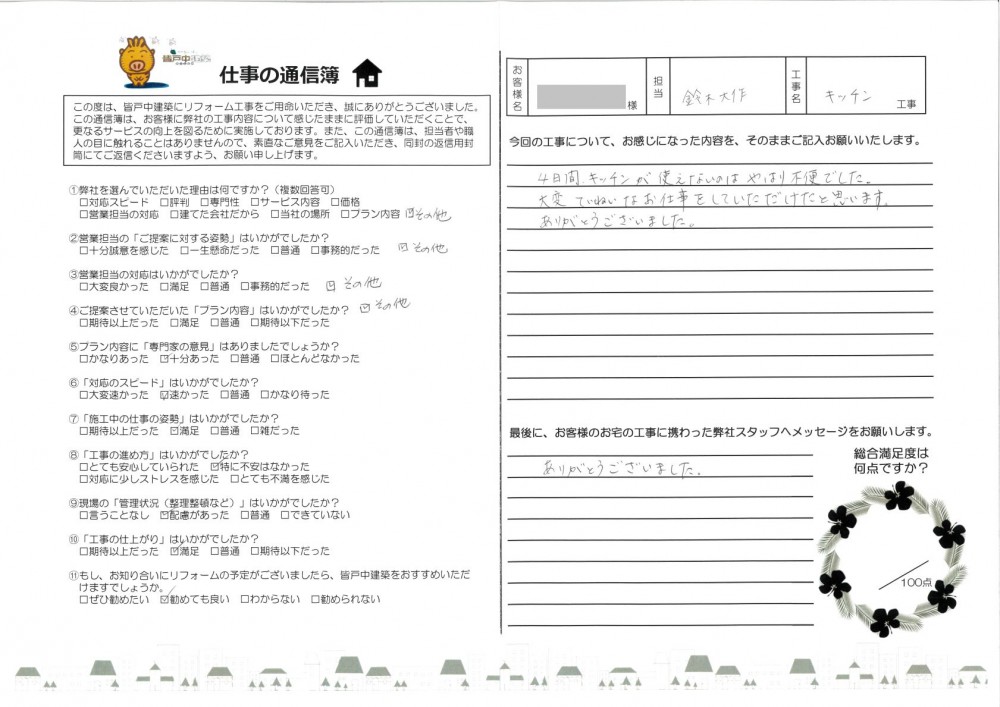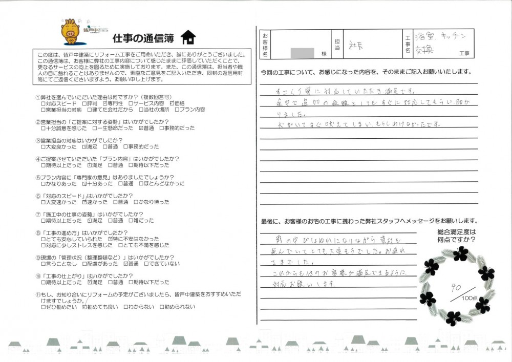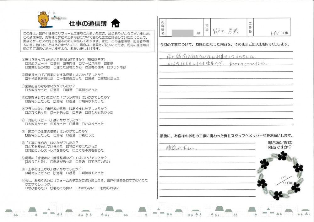 皆戸中建築でリフォームをして頂いたお客様からの「仕事の通信簿」をご紹介いたします!
