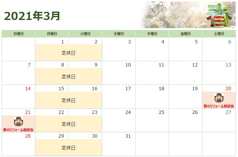 [浜松市] 【浜北ショールーム 3月営業カレンダー】