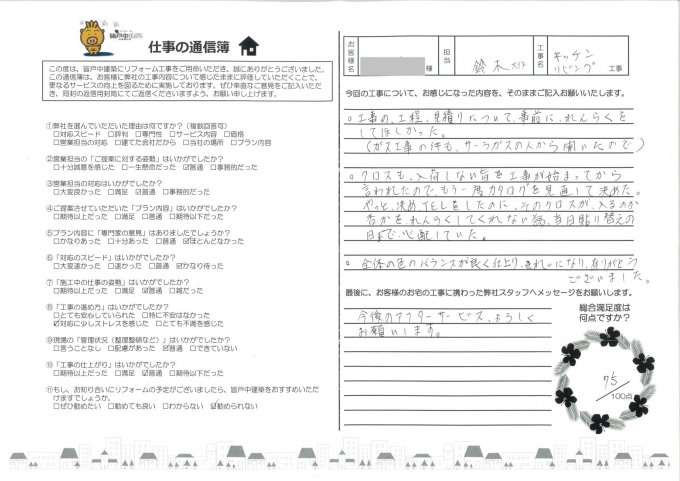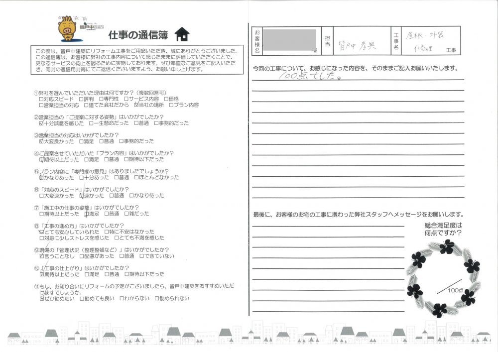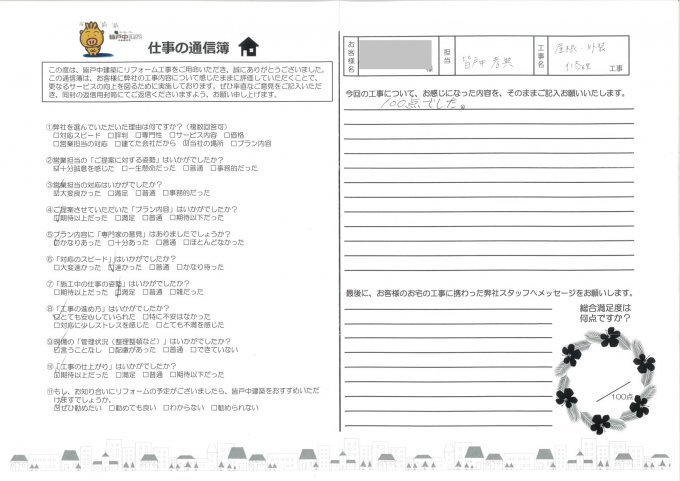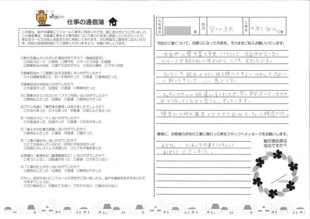 皆戸中建築でリフォームをして頂いたお客様からの「仕事の通信簿」をご紹介いたします!