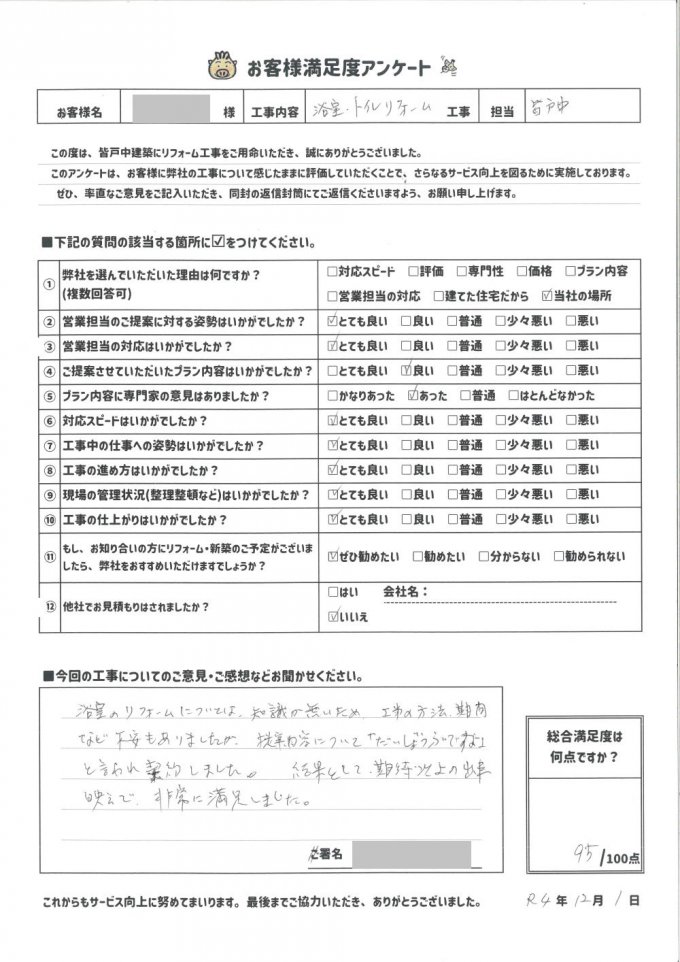浴室のリフォームについては知識がないため、工事の方法・期間など不安もありましたが、提案内容について「大丈夫ですよ」と言われ契約しました。
