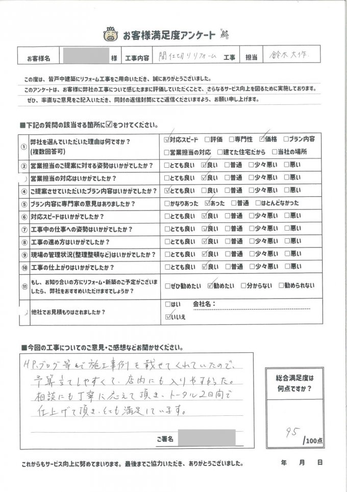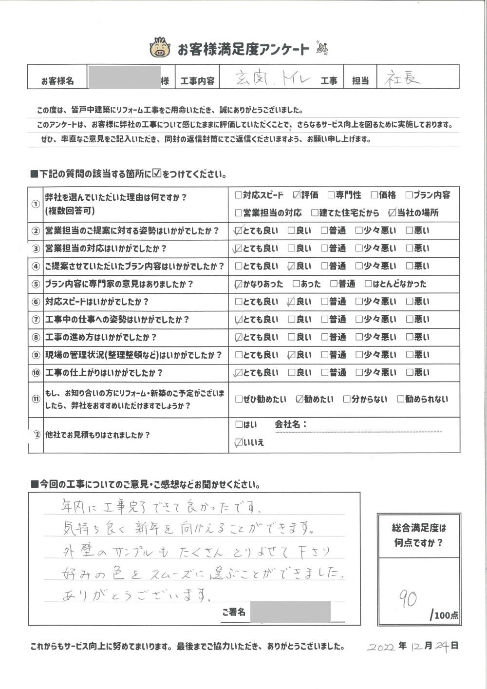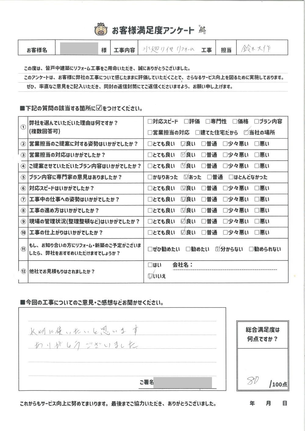 皆戸中建築で各種リフォームをして頂いたお客様からの