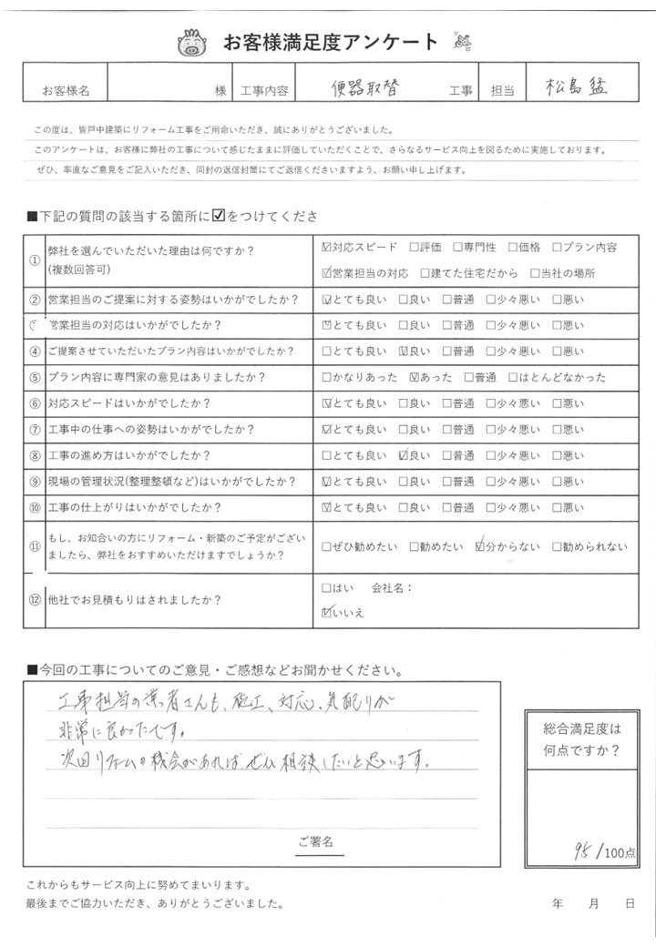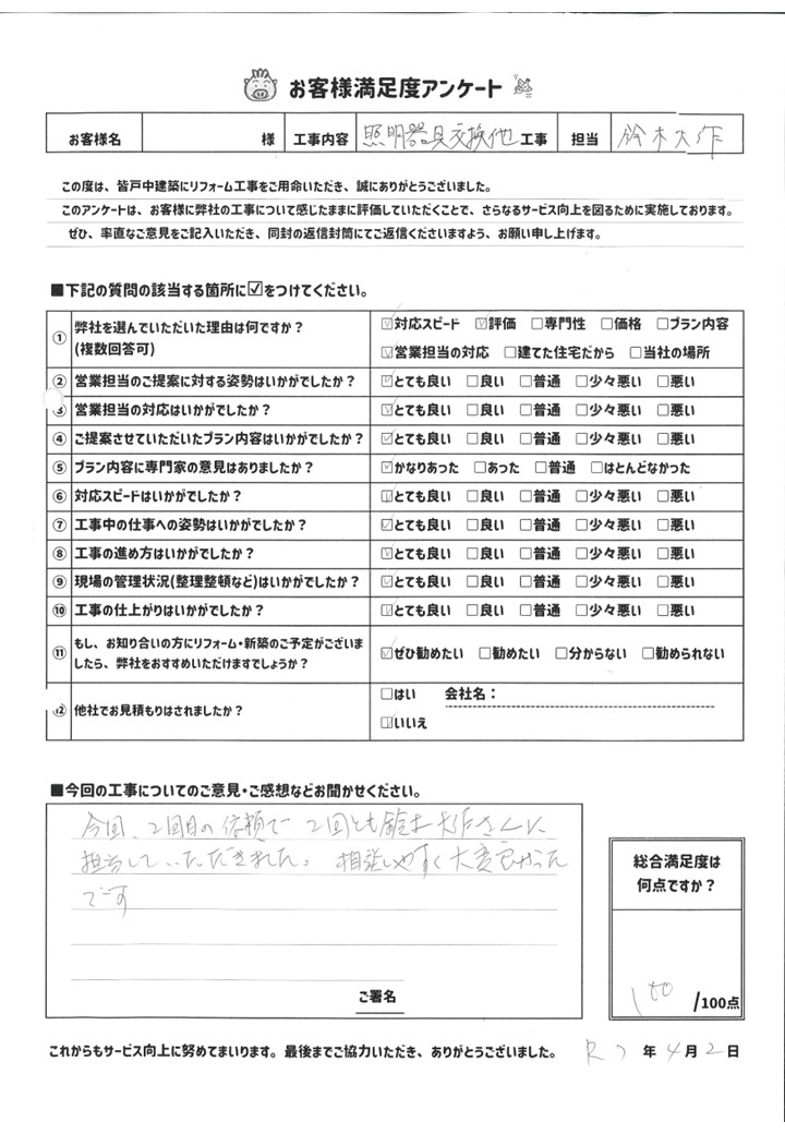 皆戸中建築で各種リフォームをして頂いたお客様からの