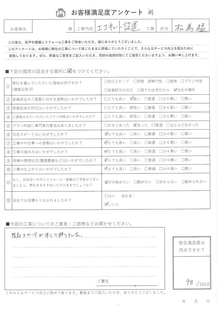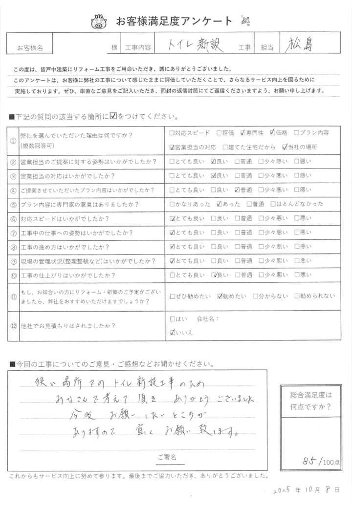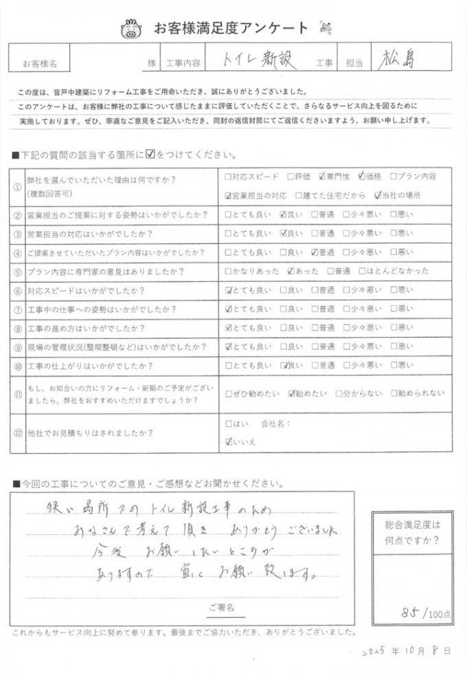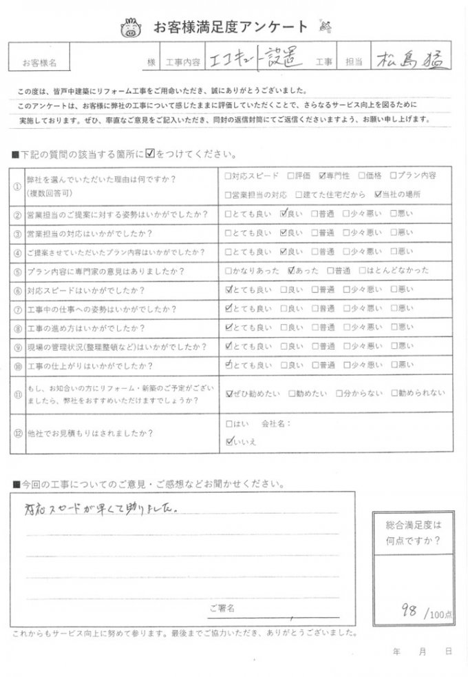 皆戸中建築で各種リフォームをして頂いたお客様からの