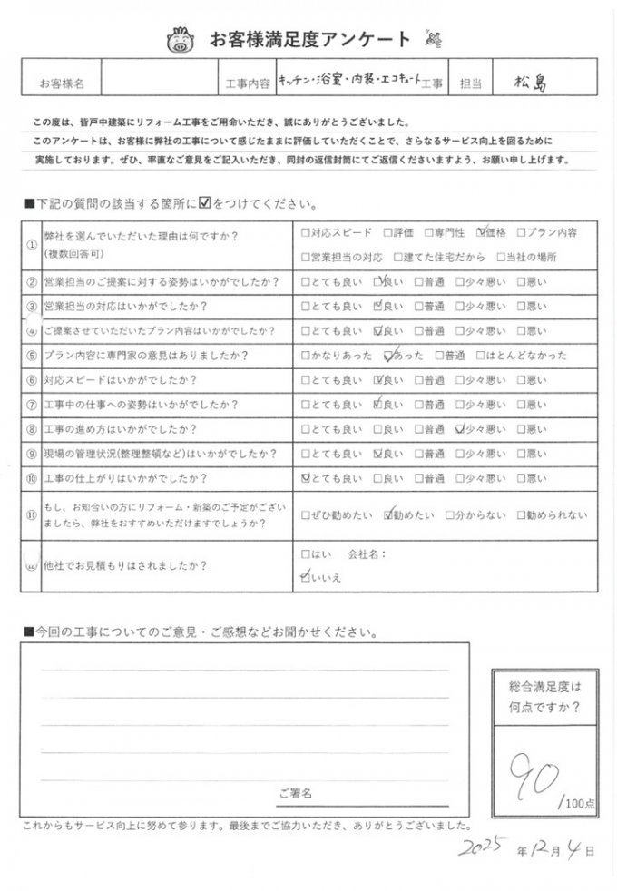 皆戸中建築で各種リフォームをして頂いたお客様からの
